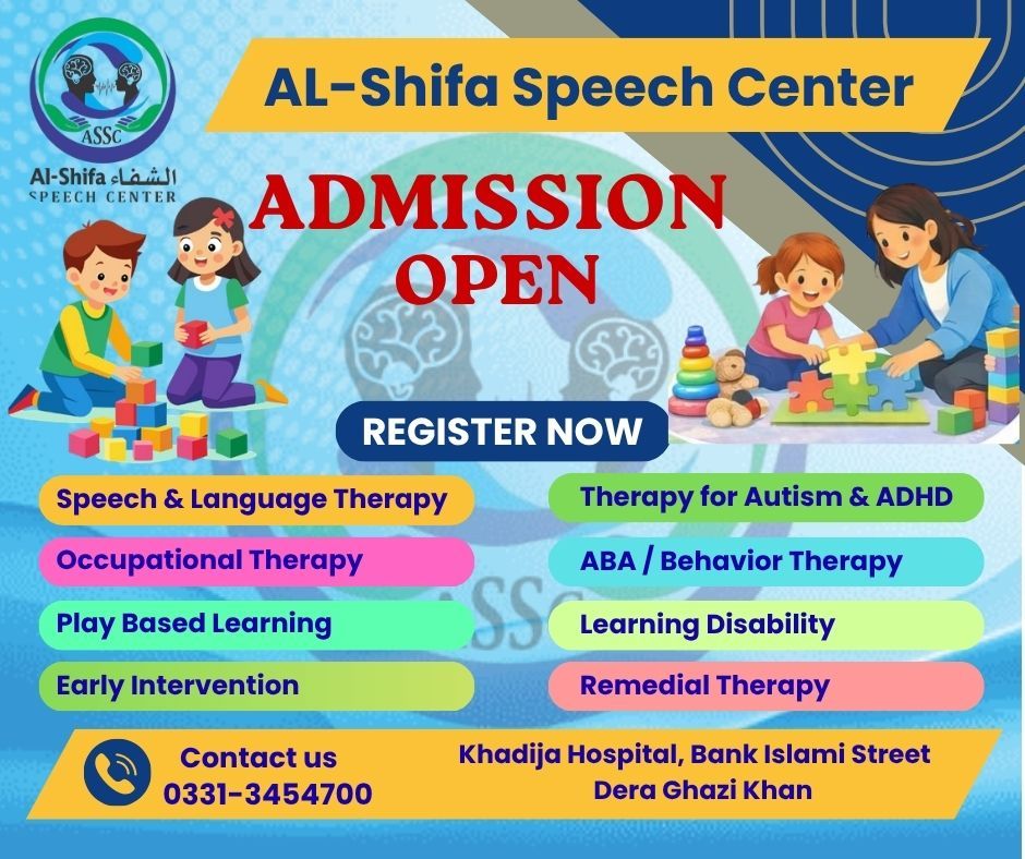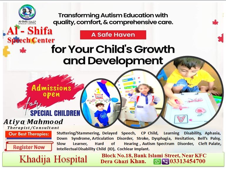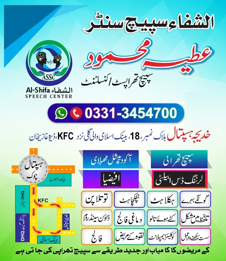 Al Shifa Speech Center, Khadija Hospital, Bank Islami Street, near KFC, Fareed Abad BLOCK 18, Dera Ghazi Khan